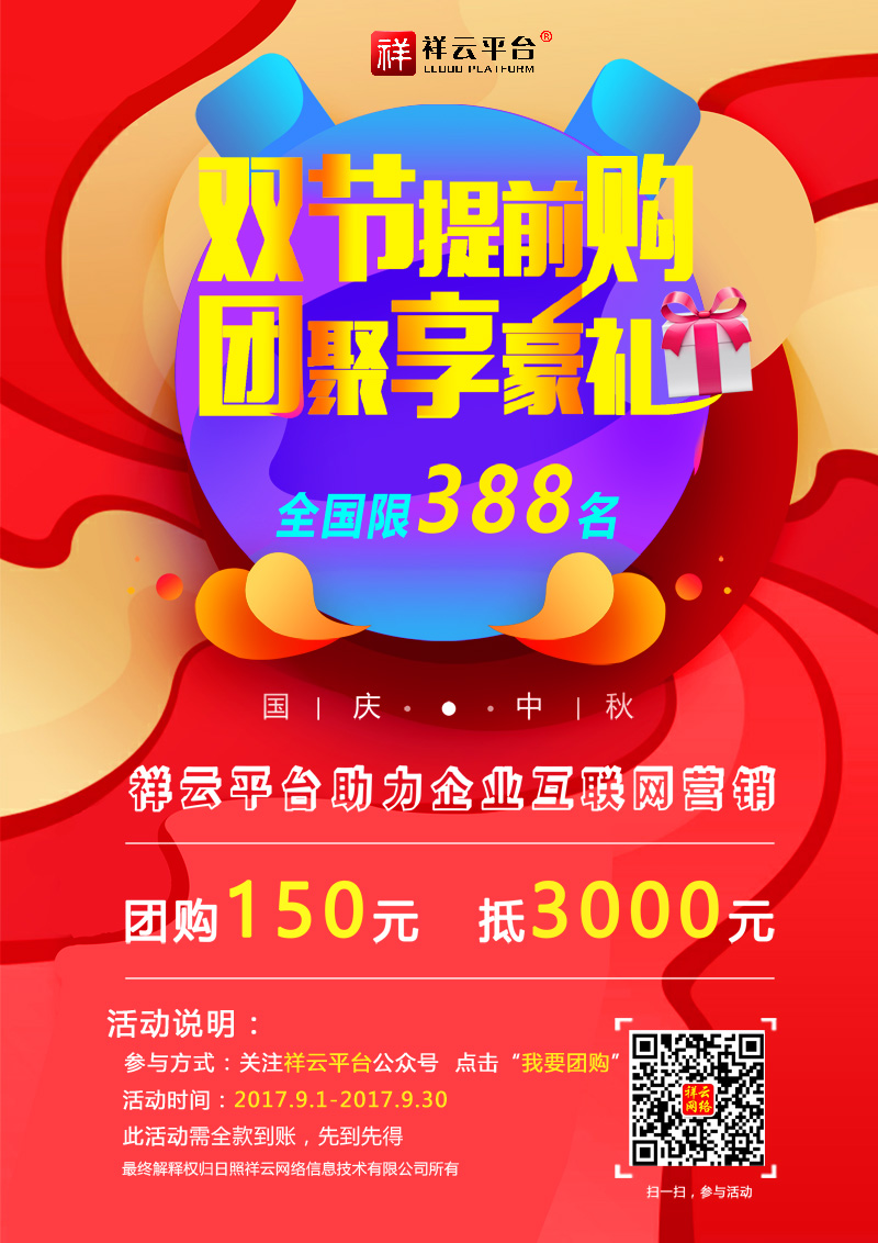 迎中秋,慶國慶,值此雙節(jié)來臨之際,祥云網(wǎng)絡(luò)助理企業(yè)互聯(lián)網(wǎng)營銷,團(tuán)購150元抵3000元;顒(dòng)進(jìn)行中……