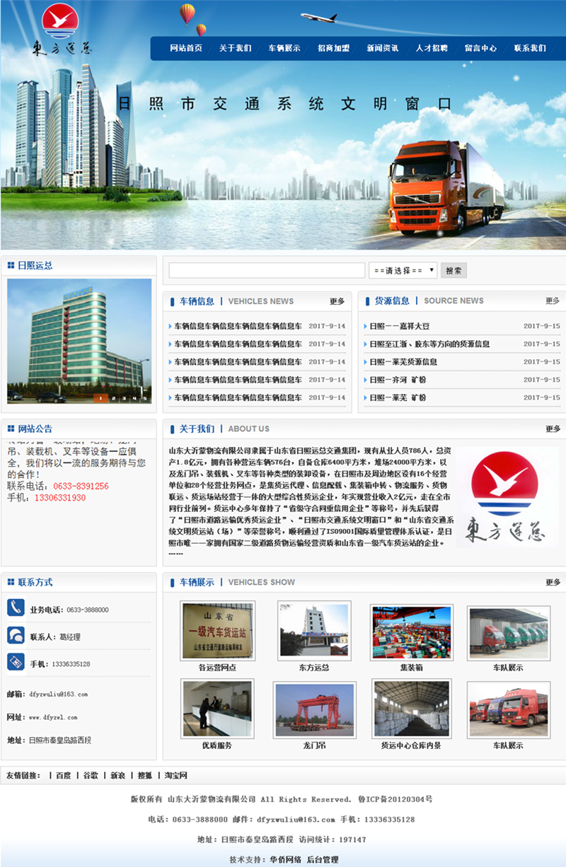 山東大沂蒙物流有限公司隸屬于山東省日照運(yùn)總交通集團(tuán),現(xiàn)有從業(yè)人員786人,總資產(chǎn)1.8億元,擁有各種營運(yùn)車輛576臺(tái),自備倉庫6400平方米,堆場24000平方米,以及龍門吊、裝載機(jī)、叉車等各種類型的裝卸設(shè)備,在日照市及周邊地區(qū)設(shè)有16個(gè)經(jīng)營單位和28個(gè)經(jīng)營業(yè)務(wù)網(wǎng)點(diǎn),是集貨運(yùn)代理、信息配載、集裝箱中轉(zhuǎn)、物流服務(wù)、貨物聯(lián)運(yùn)、貨運(yùn)場站經(jīng)營于一體的大型綜合性貨運(yùn)企業(yè),年實(shí)現(xiàn)營業(yè)收入2億元,走在全市同行業(yè)前列。貨運(yùn)中心多年保持了“省級(jí)守合同重信用企業(yè)”等稱號(hào),并先后獲得了“日照市道路運(yùn)輸優(yōu)秀貨運(yùn)企業(yè)”、“日照市交通系統(tǒng)文明窗口”和“山東省交通系統(tǒng)文明貨運(yùn)站(場)”等榮譽(yù)稱號(hào),順利通過了ISO9001國際質(zhì)量管理體系認(rèn)證,是日照市唯一一家擁有國家二級(jí)道路貨物運(yùn)輸經(jīng)營資質(zhì)和山東省一級(jí)汽車貨運(yùn)站的企業(yè)。
